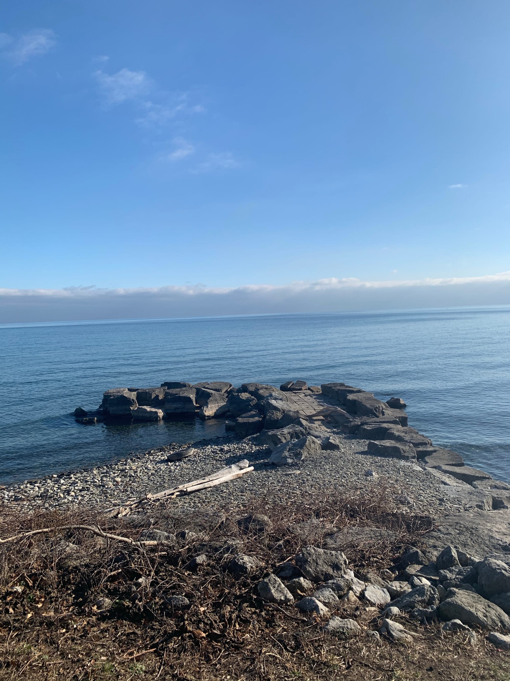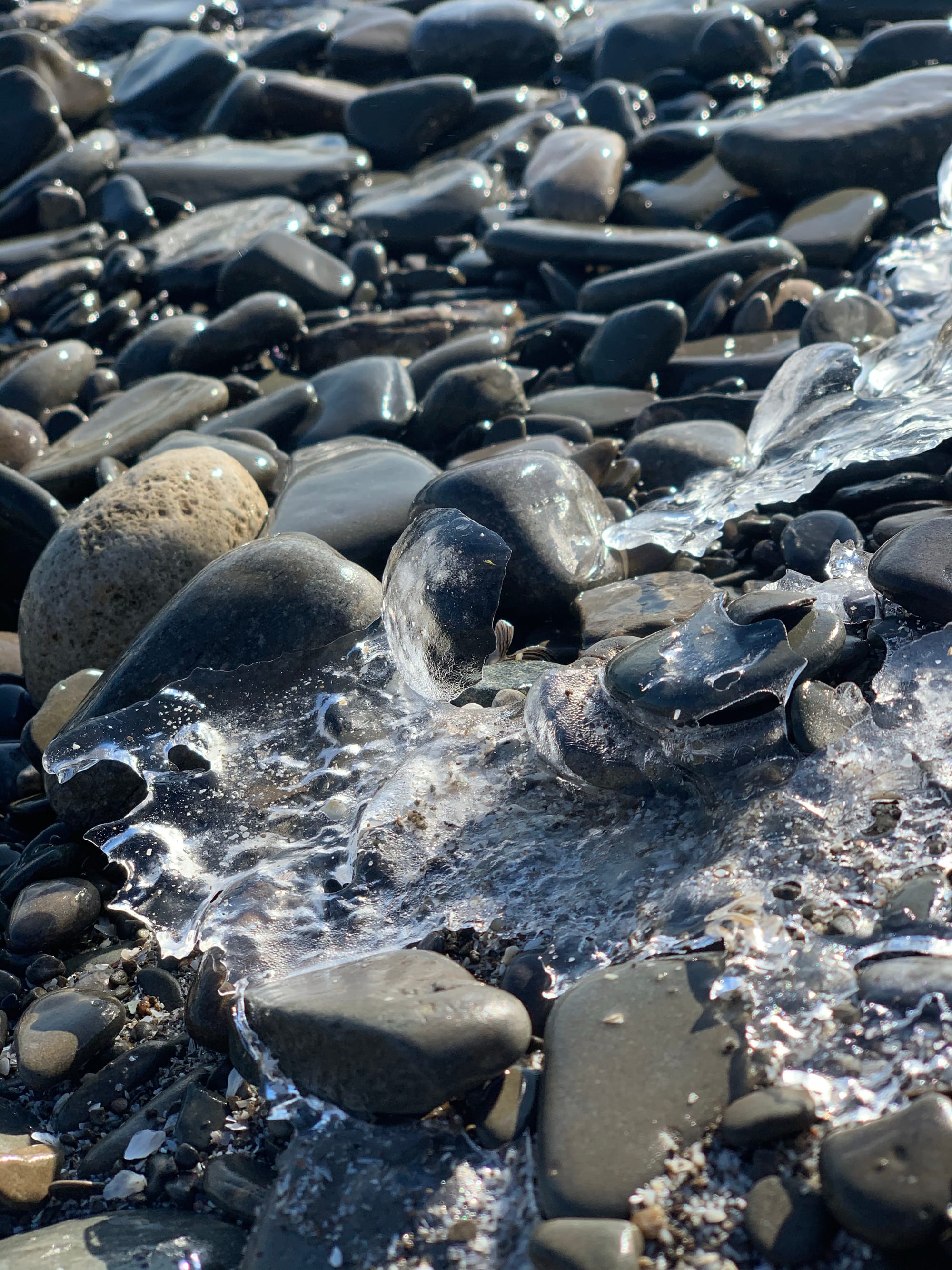 At the shore, the water is pure and clear. Gentle breeze pushes tiny waves onto the pebbles, created many beautiful crystals shells and all shapes of artworks.